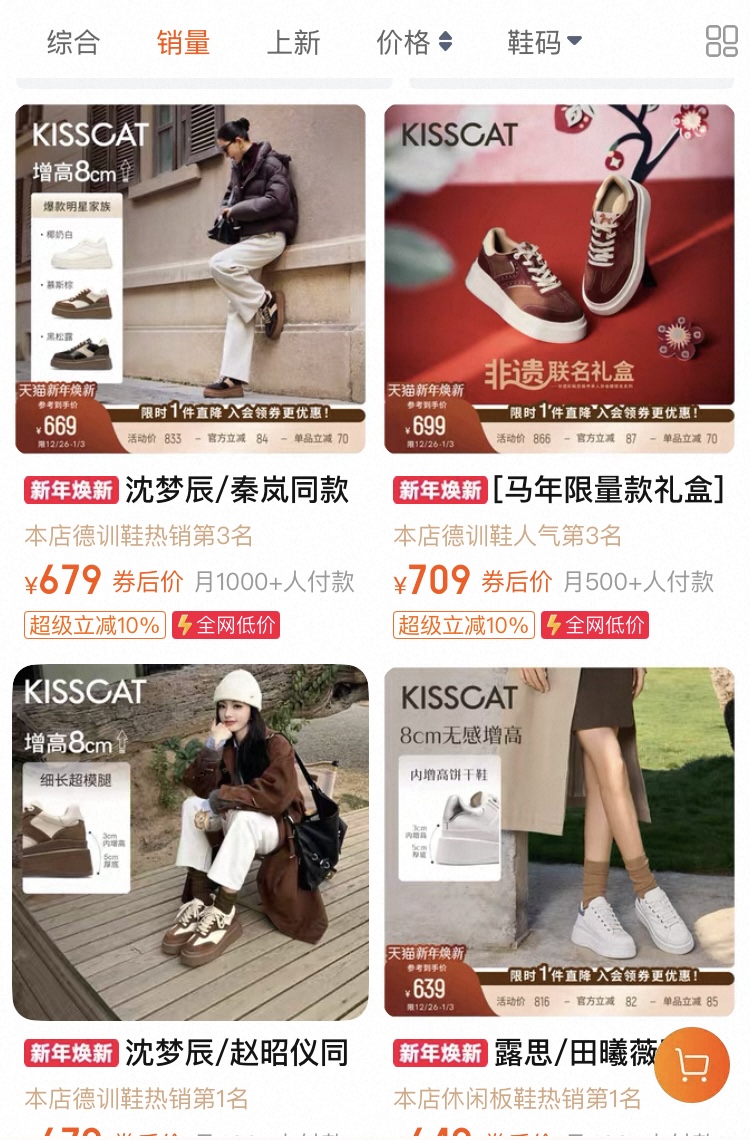 以主品牌Kisscat为例,界面新闻搜索发现,其在电商平台的主推鞋款多为厚底鞋,以无感增高、隐形增高等为卖点。然而以老爹鞋为代表的厚底鞋实际上已经是上一轮的流行,近两年时尚圈刮起的是薄底鞋风潮。而且相似鞋款的产品在各类电商平台还能找到许多“平替”。