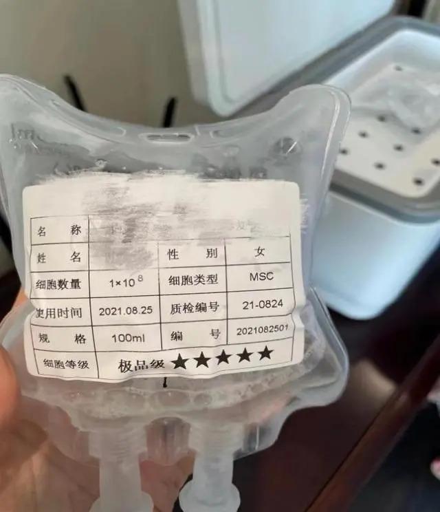 2021 年,经朋友推荐,她接触了单次注射报价 20 万元的 " 干细胞治疗 "。她向记者展示了一张看起来极为 " 专业 " 的 " 干细胞 " 照片:一个 100 毫升容量、酷似医用输液袋的包装,标签上清晰地印着 "MSC"(间充质干细胞)、" 细胞数量 1×10^8" 等参数。" 说是从北京专门运过来的,看起来觉得很高端,打完之后还能抗衰老甚至能抗癌。" 谢杏秋回忆道。