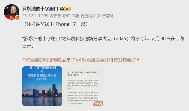 此前据第一财经报道,罗永浩近日正式宣布,将于 12 月 30 日晚 7 点在上海举办 " 罗永浩的十字路口 " 年度科技创新分享大会(2025),此举被外界普遍视为其标志性的 " 科技春晚 " 在阔别七年后的回归。