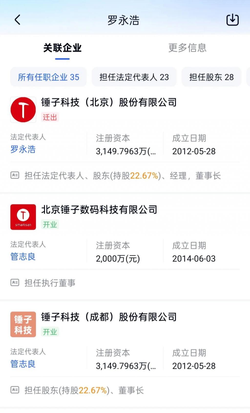 爱企查 App 显示,罗永浩名下共关联 30 余家企业,具体包括北京锤子数码科技有限公司、成都野望数码科技有限公司、北京云上卓智咨询中心(有限合伙)等,版图涉及数码、教育、投资管理等领域,其中 10 余家为开业状态。罗永浩在上述企业中担任董事长、执行董事、法定代表人等重要职务,并持有其中近 30 家企业的股份。