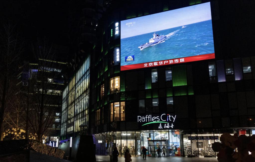 ▲周一,北京的一个公共屏幕上播放了解放军东部战区军演的新闻。(图源:路透 · 社)