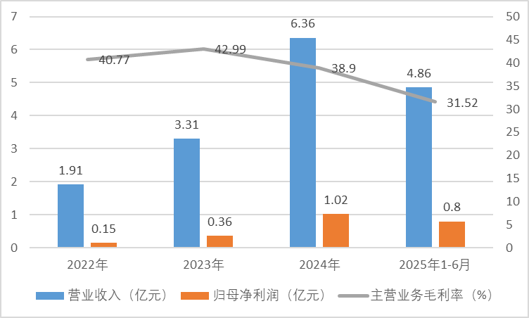 千分一在报告期(2022年至2025年上半年)内,营业收入和净利润整体呈上升趋势。营业收入分别为1.91亿元、3.31亿元、6.36亿元、4.86亿元;归母净利润分别为1479.51万元、3648.77万元、1.02亿元、8037.12万元。