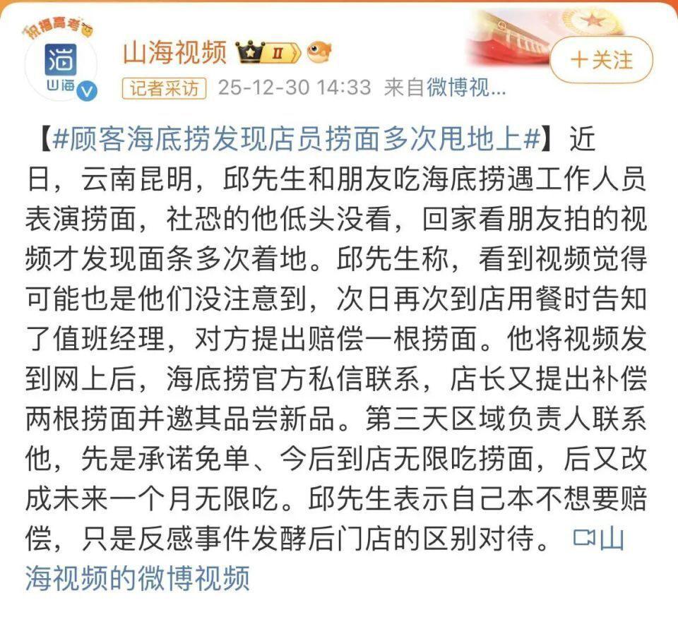 12 月 30 日," 顾客海底捞发现店员捞面多次甩地上 " 冲上微博热搜第一。