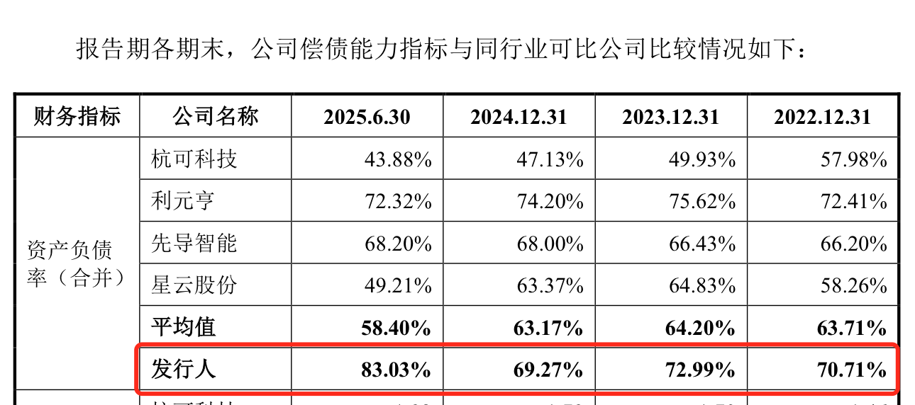 恒翼能对资金的需求体现在长期借款的持续增长上,该项数据从2022年的4972.83万元增至2025年上半年的2.05亿元。整体上,公司合并资产负债率也从2022年的70.71%一路攀升至2025年上半年的83.03%,显著高于同行业可比公司平均水平。