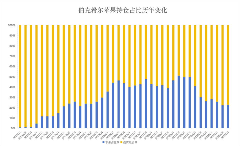 根据 Dataroma 的数据统计,截至 2025 年三季度末,伯克希尔对苹果的持仓占其股票投资组合的比例已从顶峰时的 51% 下降至约 22.69%。这一减持行为,显著降低了单一股票对投资组合的集中度风险。