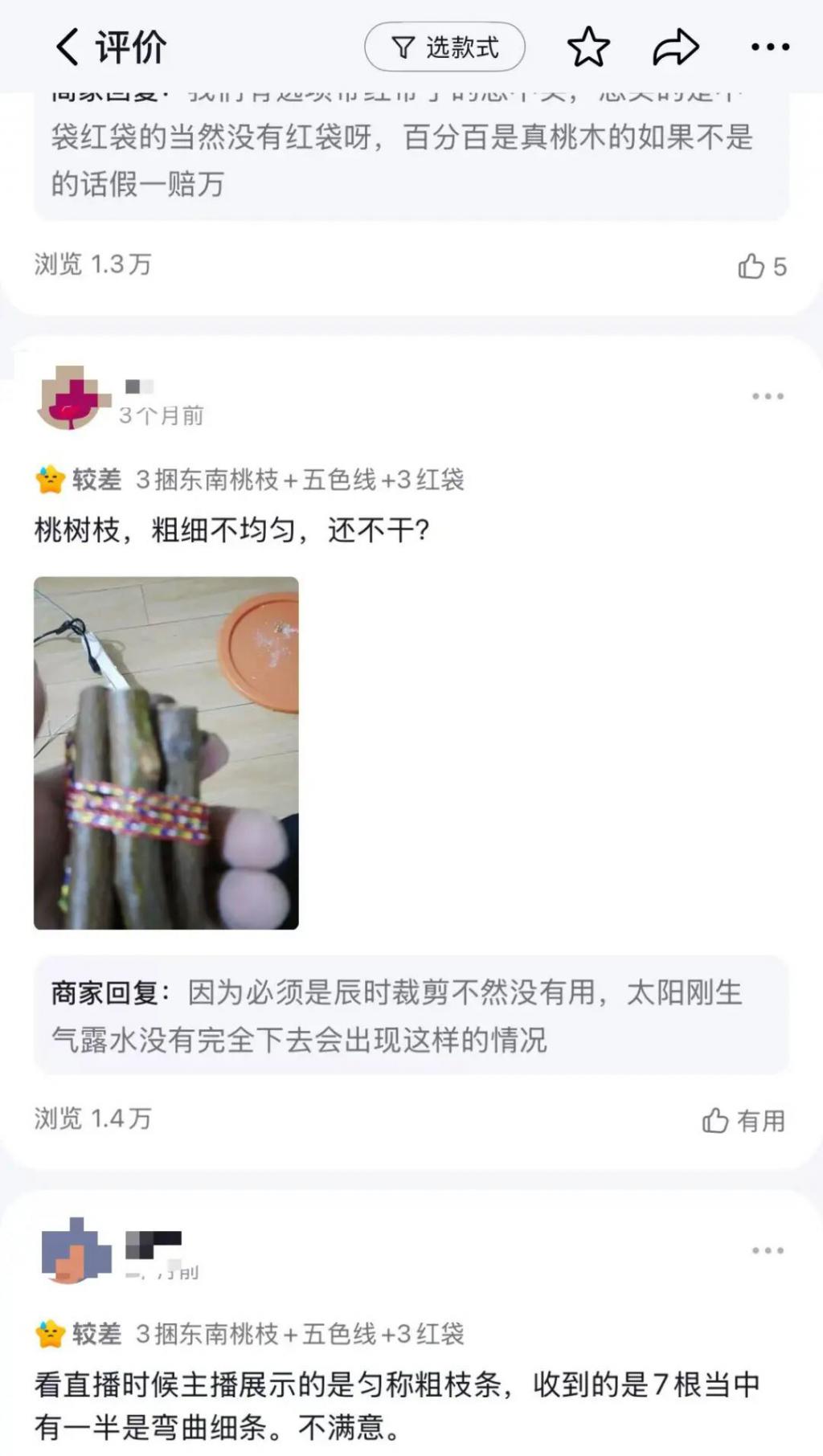 而在博主主页购物橱窗中,售卖的商品也是褒贬不一,有的消费者表示收到的商品很好,而有的却吐槽:" 做工太次 "" 收到的桃木发霉了 " 等等。