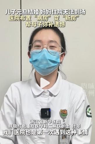 首页 > 学习 元旦大婚遇母亲住院,杭州医院把病房变“新房”,新郎直夸:太感谢了 1 月 1 日,浙江杭州一家医院内,一位母亲因住院无法到场儿子婚礼,医院帮母亲将病房变为 " 新房 ",弥补一家人遗憾。视频里,新娘给病房里的婆婆敬茶。儿子接受采访时表示,母亲康复的过程中,状态不是特别好,医生拒绝了母亲的外出请求。但在医院的安排下,我们可以在这里敬茶,很感谢医生和护士长,帮忙费心布置,也帮她完成一个心愿。医院工作人员表示,这也是他们第一次遇到这种事情,找了视频,提前一天给他们布置起来。