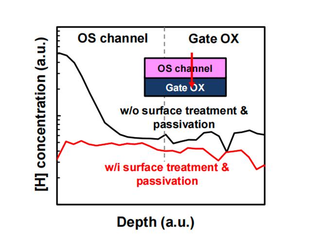 图 5: OS 沟道的 SIMS 深度剖面,显示通过表面处理与钝化有效降低了沟道中的氢含量。