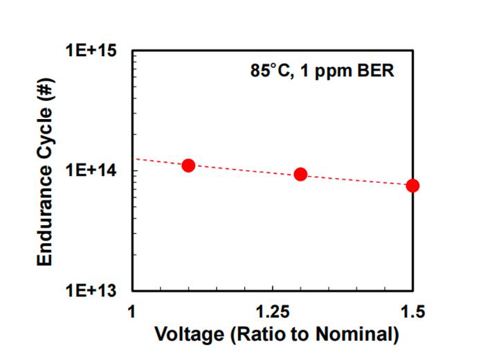 图 6: 1T-1C 存储芯片的耐久性测试结果,在 85 ℃ 条件下经过 10¹ ⁴ 次循环后,误码率(BER)仍低于 1 ppm。
