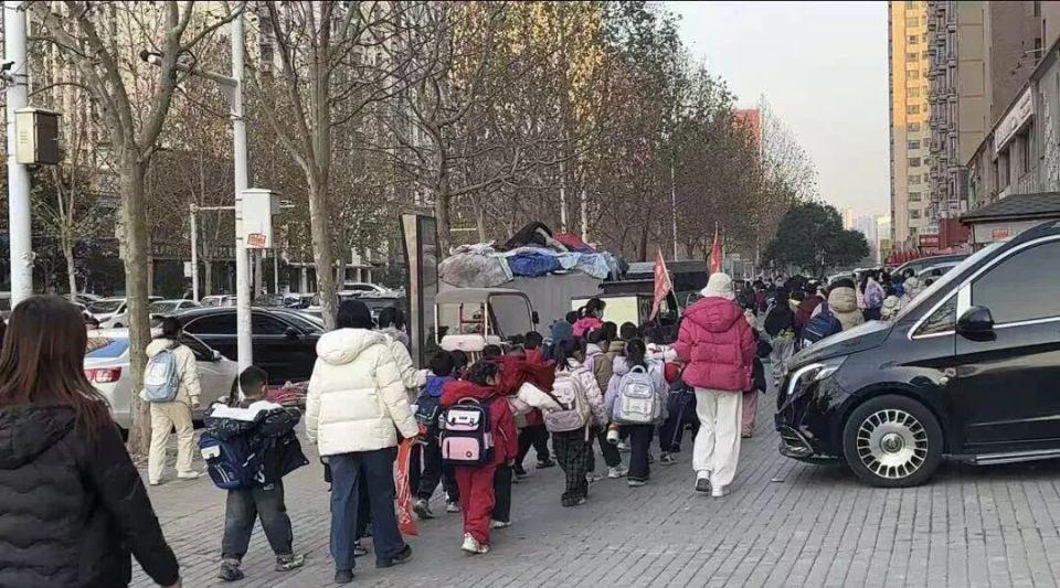 记者注意到,在丰庆路与金冠路交叉口的西北角就是金水区丰庆路小学,一到放学时间就有不少学生会从豫武康居小区北门的人行道经过,不管是家长还是学生,想要通过都需要绕开这堆杂物行走。