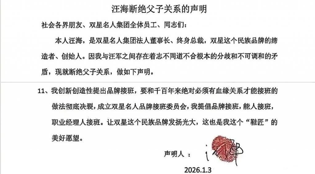 双星名人集团创始人汪海,突然发了一份公开信,对自己的儿媳列了九大罪状。比如抢夺公章,儿子汪军被汪海压制 20 多年,产生 " 仇父 " 心理,联合竞争对手,背叛自家企业,背叛品牌等。