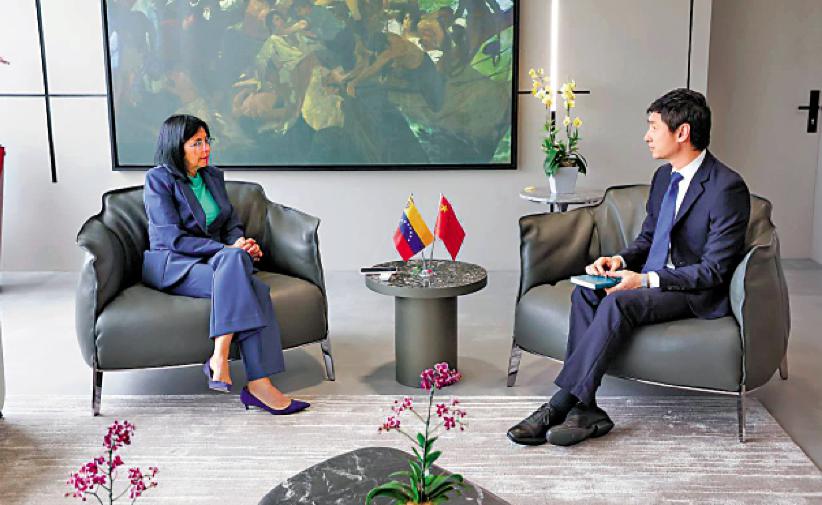 委内瑞拉临时总统德尔西 · 罗德里格斯日前会见中国驻委内瑞拉大使蓝虎,赞赏中方对美国侵委行径展现坚定立场。网络图