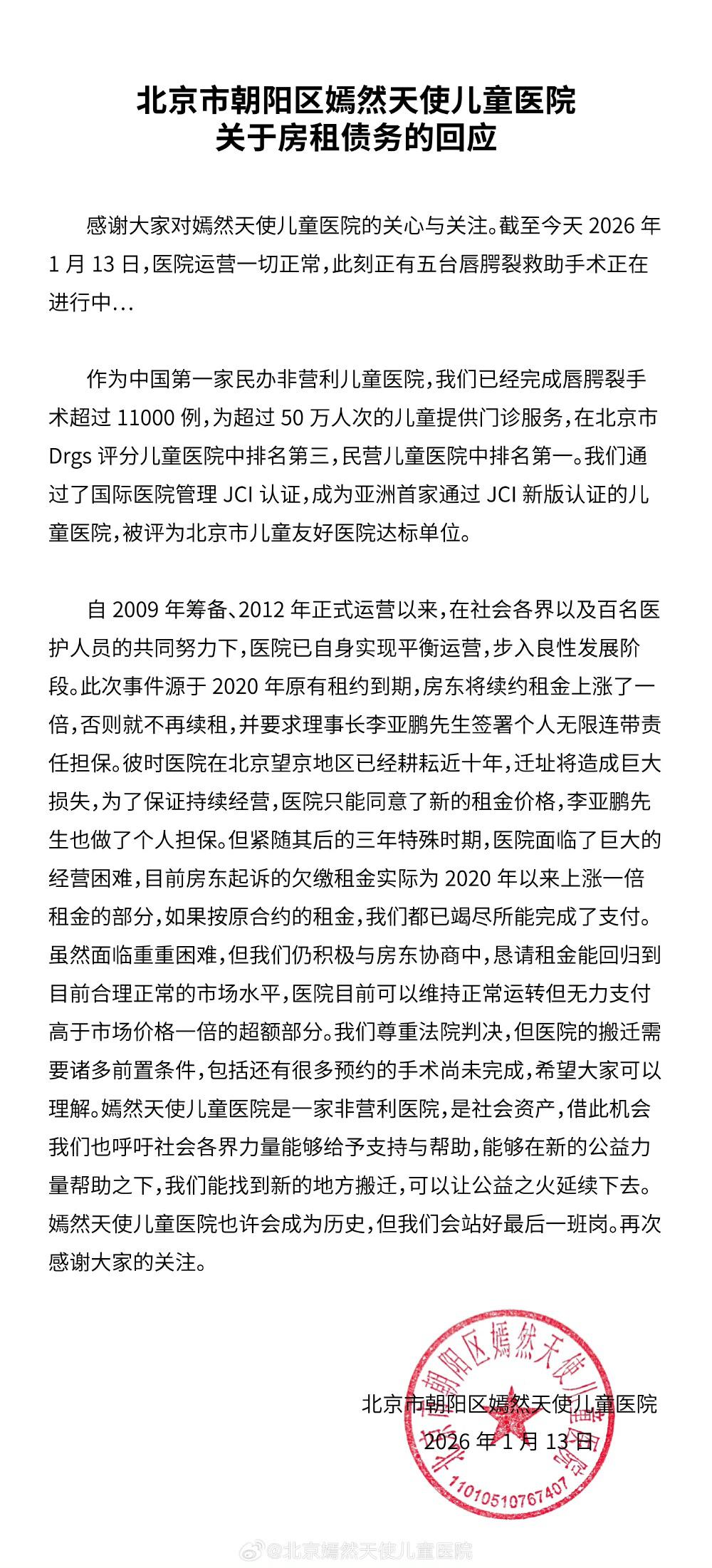 嫣然儿童医院陷租金纠纷,房东及李亚鹏最新发声