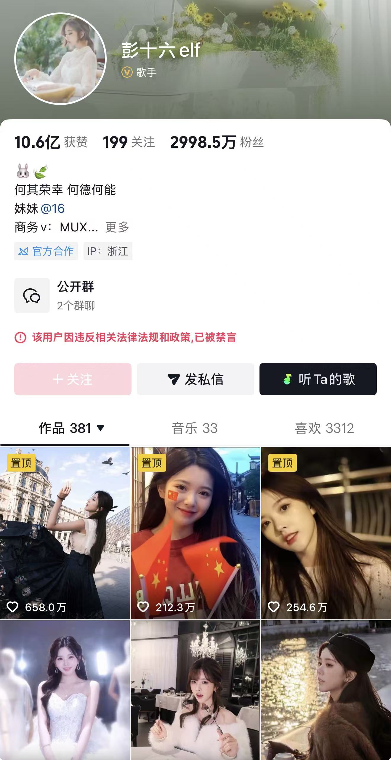 公开资料显示,彭十六本名彭煊之,出生于浙江省,中国内地女歌手、演员、网络主播。界面新闻查阅获悉,其抖音账号“彭十六elf”有近3000万粉丝。其主页显示该用户因违反相关法律法规和政策,目前已被禁言。此外,其同名的快手(粉丝约436万)、微博(粉丝约310万)、小红书(粉丝约85万)账号均已被禁言。