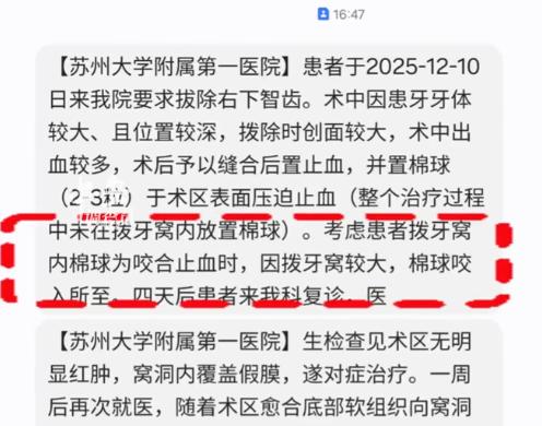 男子表示,到目前为止,除了苏州大学附属第一医院医生的一个私聊电话和院方的短信通知,院方没有任何人联系他处理此事。且院方的短信通知上还写着 " 考虑患者拔牙窝内棉球为咬合止血时,因拔牙窝较大,棉球咬入所致 "。