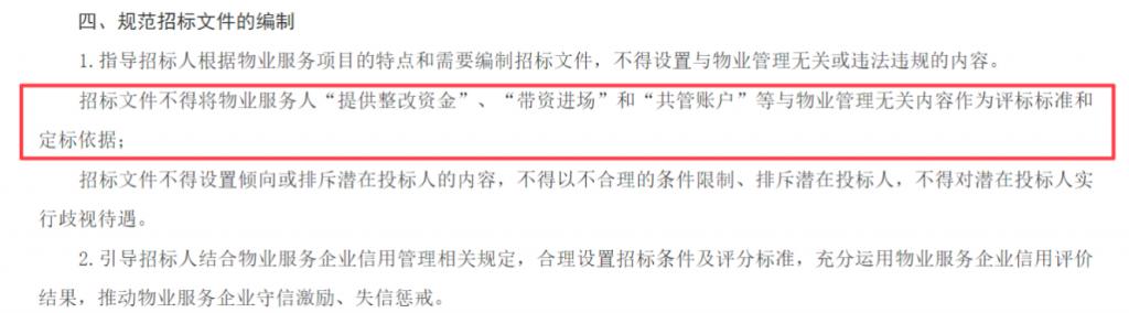 如安徽省社区服务业协会曾发文称其为 " 补贴战 ",挤压中小物企空间,长期损害服务质量。赣州市城市住房服务中心 2024 年也曾发文,招标文件不得将物业服务人 " 提供整改资金 "" 带资进场 " 和 " 共管账户 " 等与物业管理无关的内容作为评标标准。