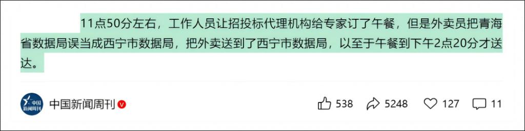 给专家点了外卖,但外卖员把青海省数据局误当成西宁市数据局,把外卖送到了西宁市数据局,以至于午餐到下午 2 点 20 分才送达。