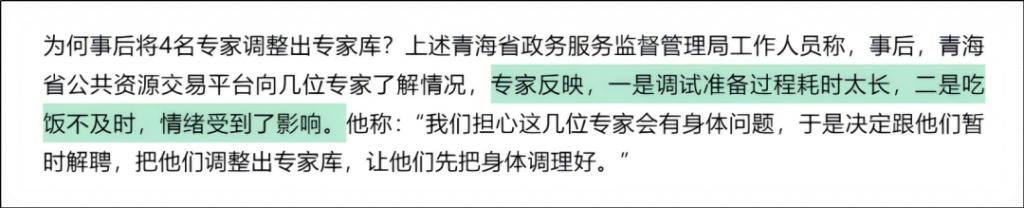 原来这场跨省评标里,青海地区是副场,他们就从专家库中随机抽取了 4 名专家,3 人是 "60 后 ",1 人是 "70 后 "。年纪都不小了。