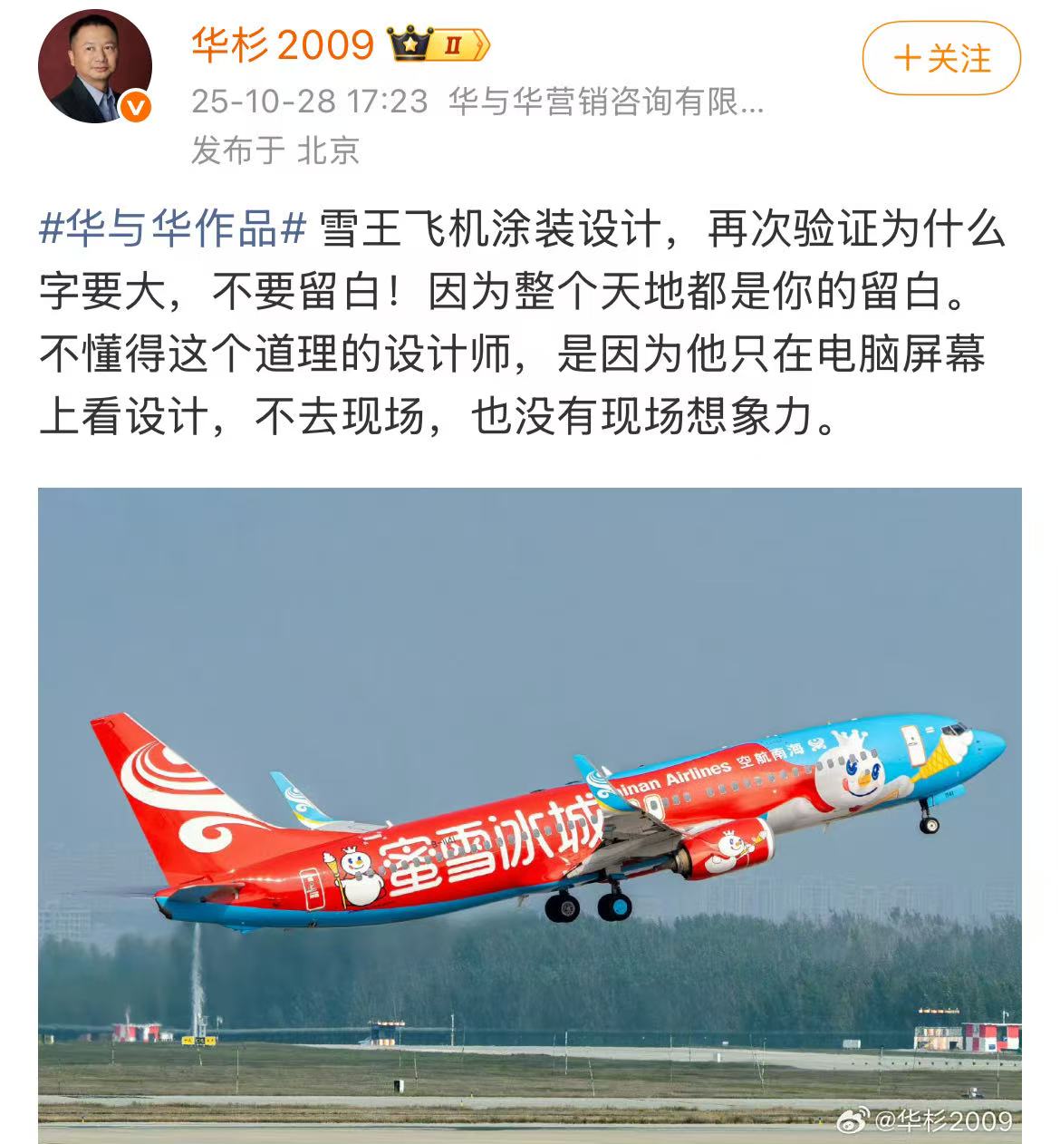他在微博上发了一张蜜雪冰城涂装飞机的照片来验证自己的设计正确,“雪王飞机涂装设计,再次验证为什么字要大,不要留白!因为整个天地都是你的留白。不懂得这个道理的设计师,是因为他只在电脑屏幕上看设计,不去现场,也没有现场的想象力。”