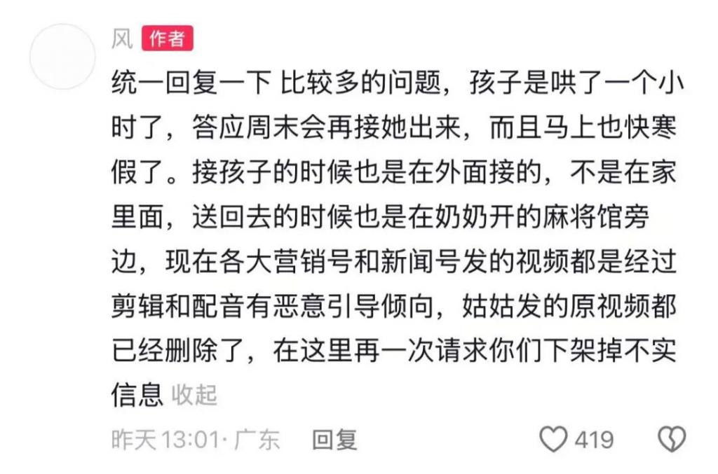 " 我们自己也很心痛,不管有没有错,我们不想去争辩。" 全先生称女孩姑姑已自行删除视频,但事件发酵后,目前女孩母亲情绪在崩溃边缘。