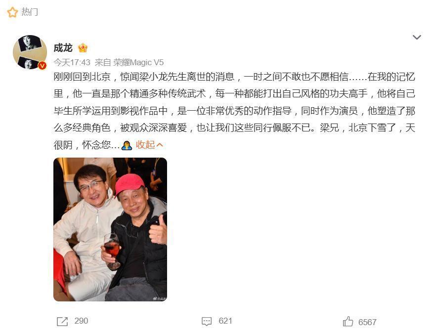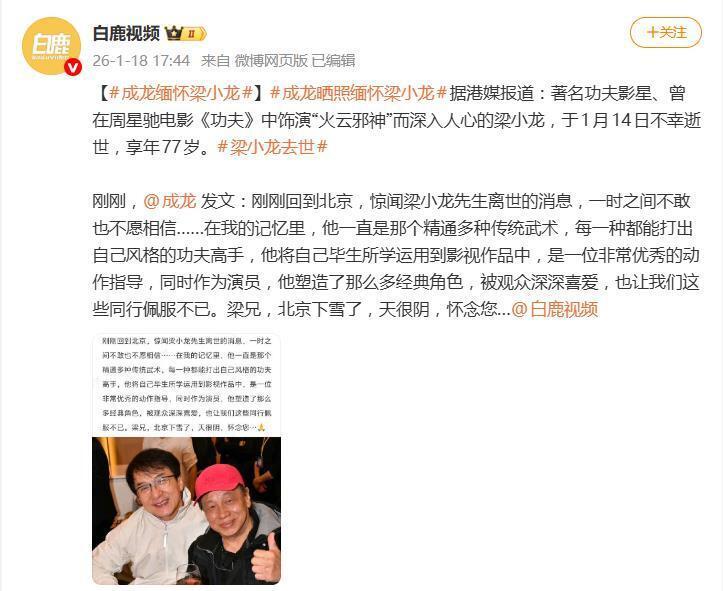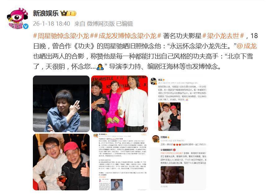 几乎同一时间,另一位功夫巨星成龙也在微博发文悼念。他并未停留在简单致哀,而是具体回忆了梁小龙的武术造诣,称赞他 " 精通多种传统武术,每一种都能打出自己风格 "。成龙还分享了两人最后一次见面的细节,并以一句充满画面感的 " 北京下雪了,天很阴,怀念您 …",将私人情感与自然景象交融,哀思绵长。