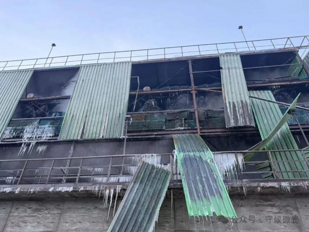1 月 18 日 17 时许,内蒙古包头市包钢板材厂爆炸事故现场,摇摇欲坠的金属板旁边,围栏上有多处液体渗出结冰。中青报 · 中青网记者 石佳 / 摄