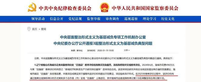 为基层减负专项工作机制办公室会同中央纪委办公厅对 3 起整治形式主义为基层减负典型问题进行通报。其中,辽宁省海城市花费近五百万元高额费用,向某 " 百强县 " 榜单评价机构购买咨询服务,该机构帮助其实现榜单进位。1 月 20 日,涉事的榜单评价机构赛迪顾问工作人员回应记者称,目前公司内部正进行调查,也在梳理内部的相关业务,若在调查中发现问题,会及时对外通报。