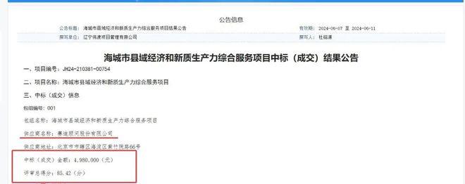 记者通过查询辽宁政府采购网获悉,2024 年 6 月,赛迪顾问股份有限公司以总得分 85.42 分,中标 " 海城市县域经济和新质生产力综合服务项目 ",中标(成交)金额为 498 万元。项目采购方为海城市工业和信息化局。