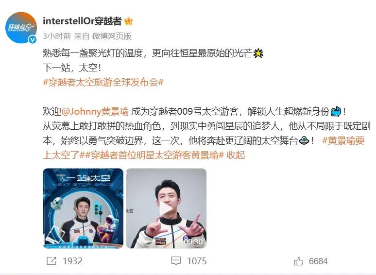 1 月 22 日,@interstellOr 穿越者 官宣 @Johnny 黄景瑜 成为 009 号太空游客,黄景瑜在 vcr 中表示很荣幸成为一名太空旅客,将乘坐中国人自己的飞船亲身抵达那片星海。