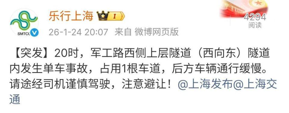 军工路隧道限高为 4.3 米,在隧道浦西和浦东入口前均设有限高标志。目前,事故原因调查及后续相关工作尚在进行中。