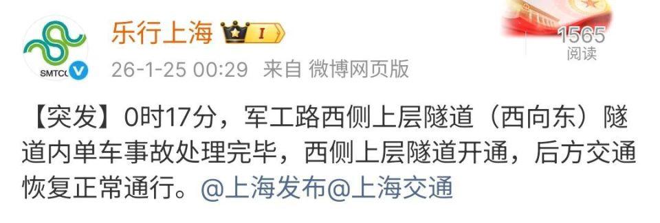接报后,交警和隧道管养人员到场。交警对军工路隧道浦西往浦东方向上层隧道入口采取交通管制措施。