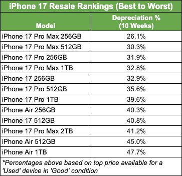 数据显示,在美国市场上市 10 周后,iPhone Air 的二手回收价相比全新机售价跌超 40%。作为对比,同存储版本的 iPhone 17 Pro Max 跌幅不到 27%,iPhone 17 Pro 跌幅不到 32%,iPhone 17 跌幅不到 33%。显然,全球市场的际遇表现,尤其美国市场的首发表现,证明 iPhone Air 不管是在产品层面,还是在定价层面,均出现了较大的「问题」。