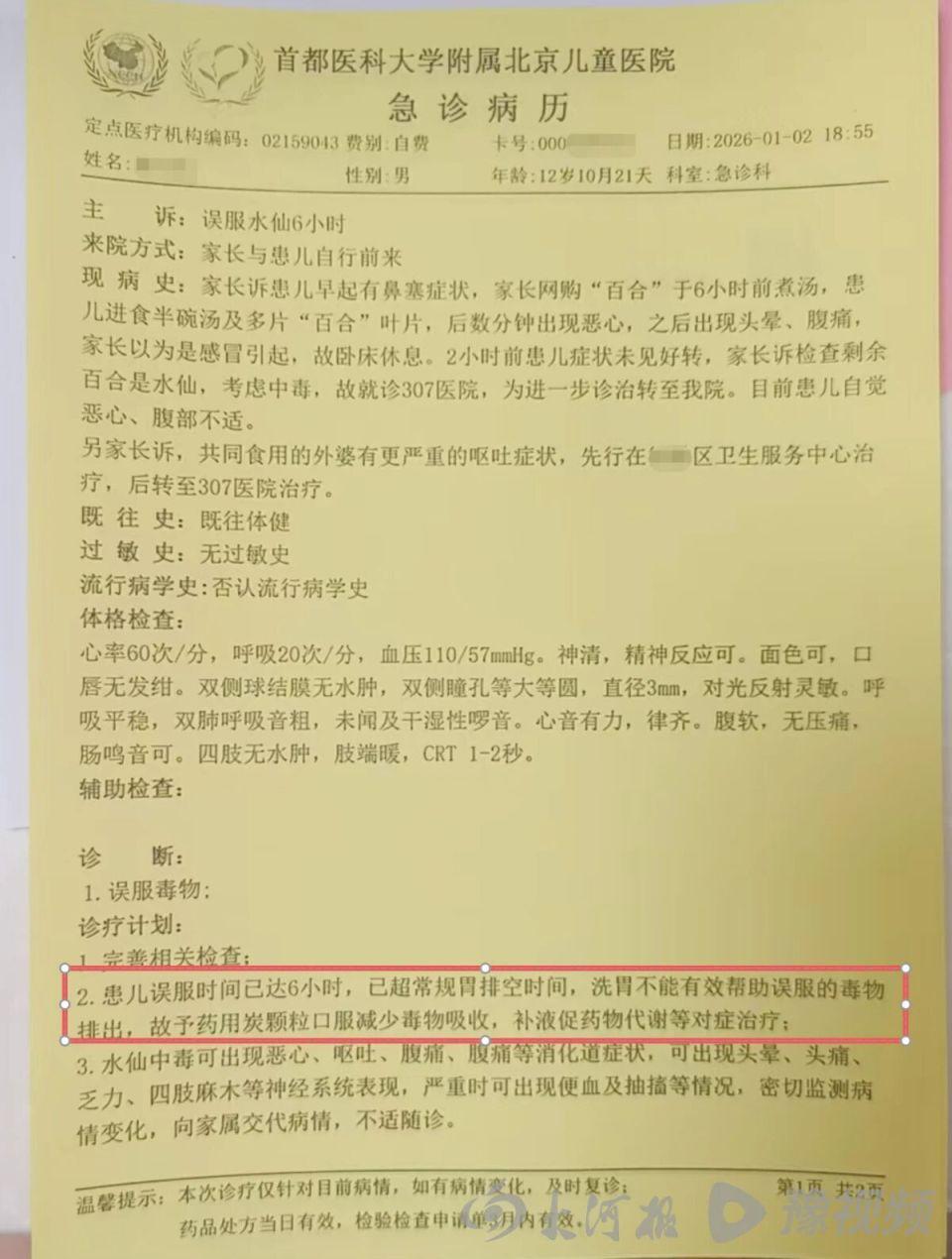邹女士说,在 307 医院急诊,医生称由于患者送医时间已超过 5 小时,毒素部分已被吸收,只能尝试排毒。母亲出院后至今胃部不适,只能吃小米粥,体重下降十余斤,需定期复查肾功能。12 岁的孩子因摄入较少,目前状况稳定,但医生表示水仙中毒可能带来长期健康影响,需持续关注。