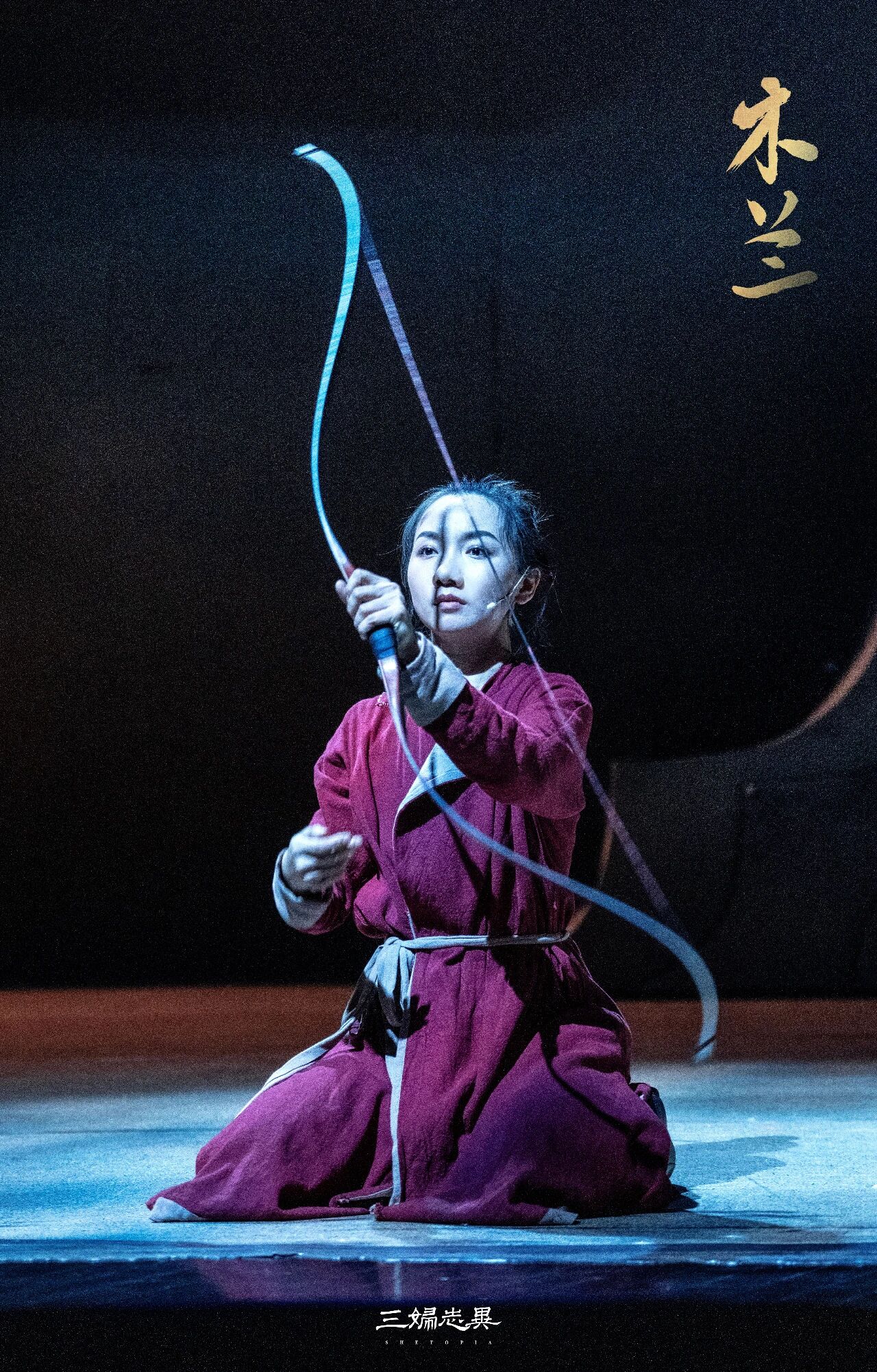 舞台中央跪立着一位身穿军装的战士,手持弓箭,在想象的战场内外厮杀。观众很快辨认出这是木兰的形象,可随后的情节却与人们熟知的故事大相径庭:木兰在军营里发现了另一个女扮男装的人,她们相互追逐,又紧紧牵起对方的手。在结尾,木兰一层一层地褪下盔甲、布衣,选择追逐她自己的叙事。