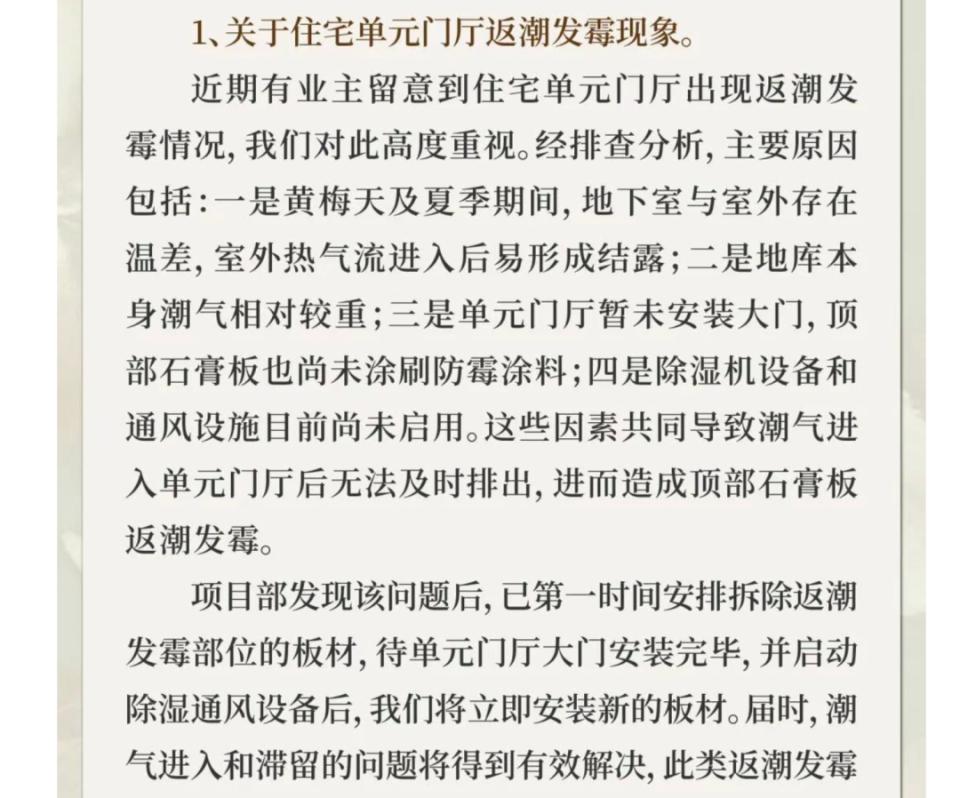 每经记者注意到,去年 8 月,港城房产在一份公开回复中曾表示:" 有业主留意到住宅单元门厅出现返潮发霉情况,我们对此高度重视。经排查分析,主要原因包括:一是黄梅天及夏季期间,地下室与室外存在温差,室外热气流进入后易形成结露;二是地库本身潮气相对较重;三是单元门厅暂未安装大门,顶部石膏板也尚未涂刷防霉涂料;四是除湿机设备和通风设备尚未启用。这些因素共同导致潮气进入单元门厅后无法及时排出,进而造成顶部石膏板返潮发霉。"