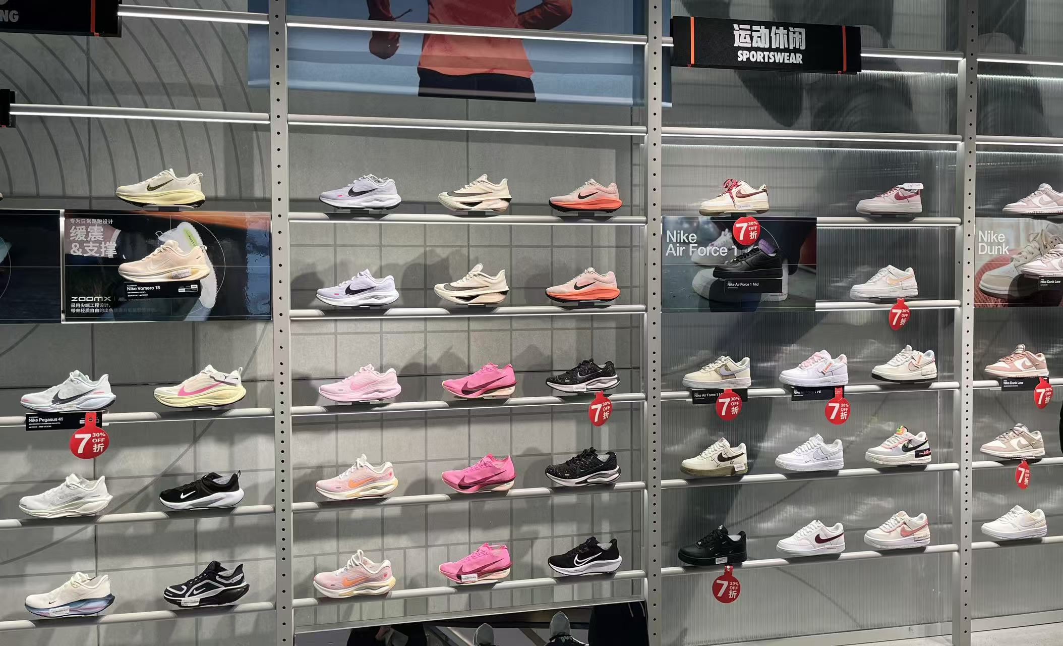 在北京一家商场中,由渠道商滔搏经营的耐克专卖店,同一时间,不少鞋子挂上了红色标志的“7折”。