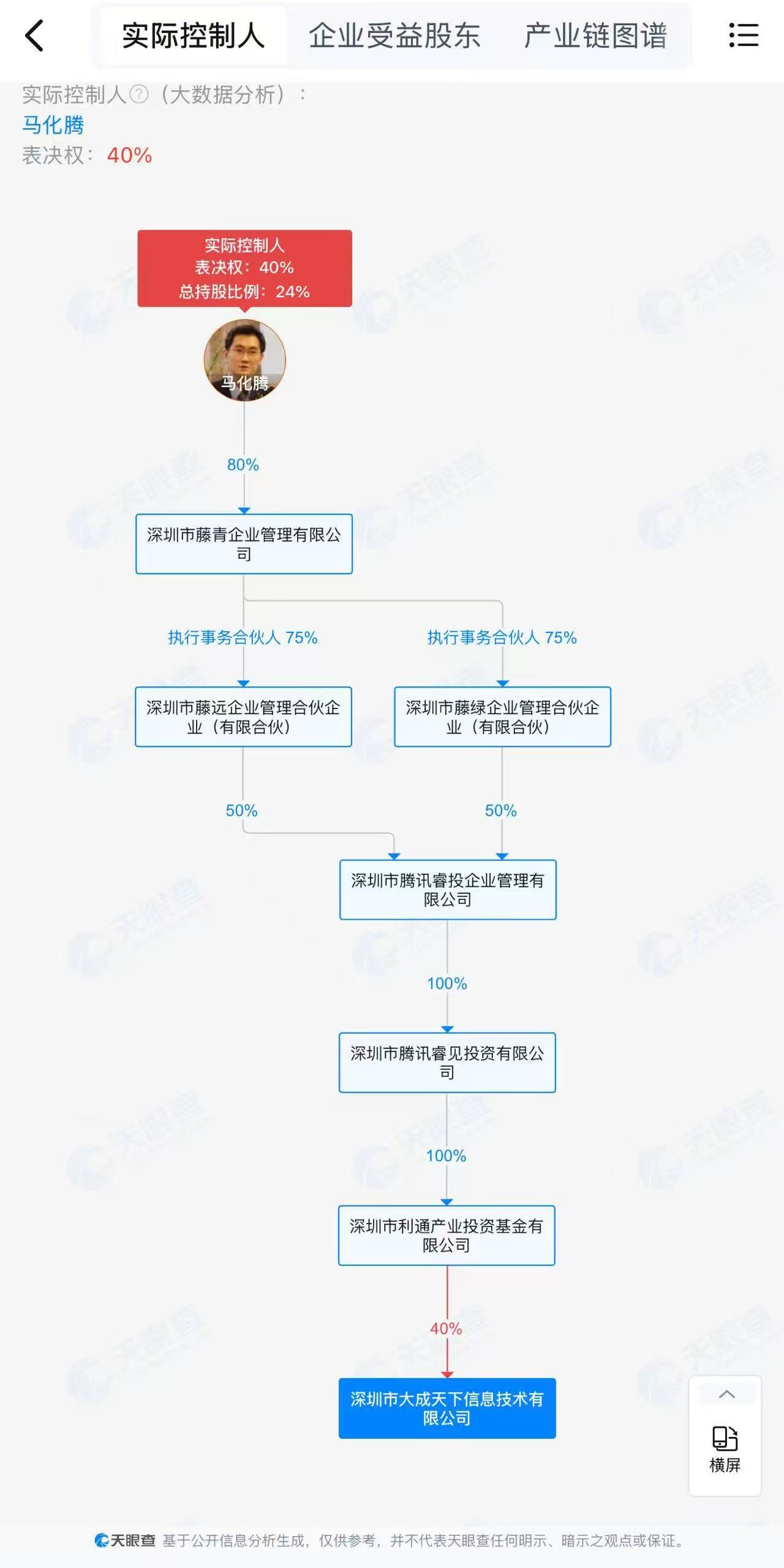 天眼查App显示,深圳市大成天下信息技术有限公司成立于2005年,注册资本超过195万,法定代表人郭杜辉。股权穿透显示,公司实控人为腾讯创始人马化腾,持股比例24%,表决权40%。
