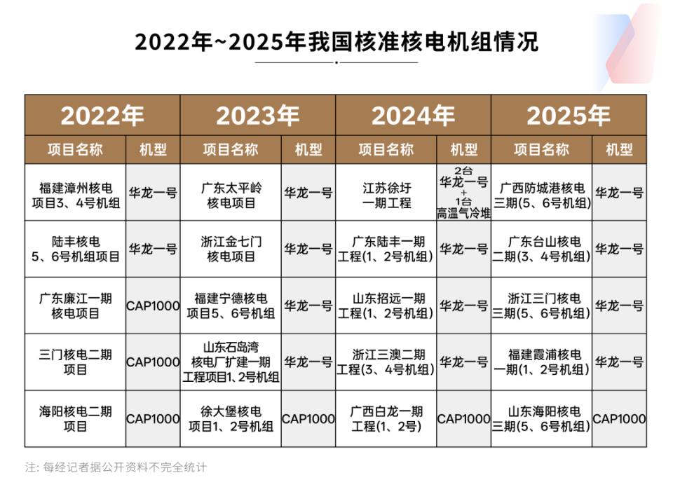 每经记者不完全梳理发现,自 2022 年以来,我国连续四年每年核准 10 台以上核电机组。并且,以我国具有完全自主知识产权的第三代核电技术 " 华龙一号 " 为主。从技术路线来看,除 2024 年获核准的江苏徐圩一期工程采用 " 华龙一号 "(三代核电技术)机组与高温气冷堆(四代核电技术的代表性堆型之一)机组相耦合模式外,其余均采用我国自主三代核电技术。