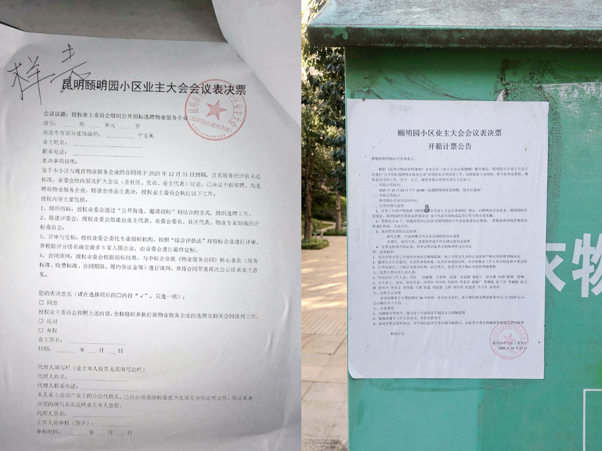 在业主们的记忆中,更换物业公司一事最早可追溯至2025年10月左右。有业主梳理发现,2025年10月7日,小区业主委员会发布了《关于召开业主大会投票的通知》,以及需业主签署的《昆明颐明园小区业主大会会议表决票》。后者授权业委会进行新物业的选聘工作。