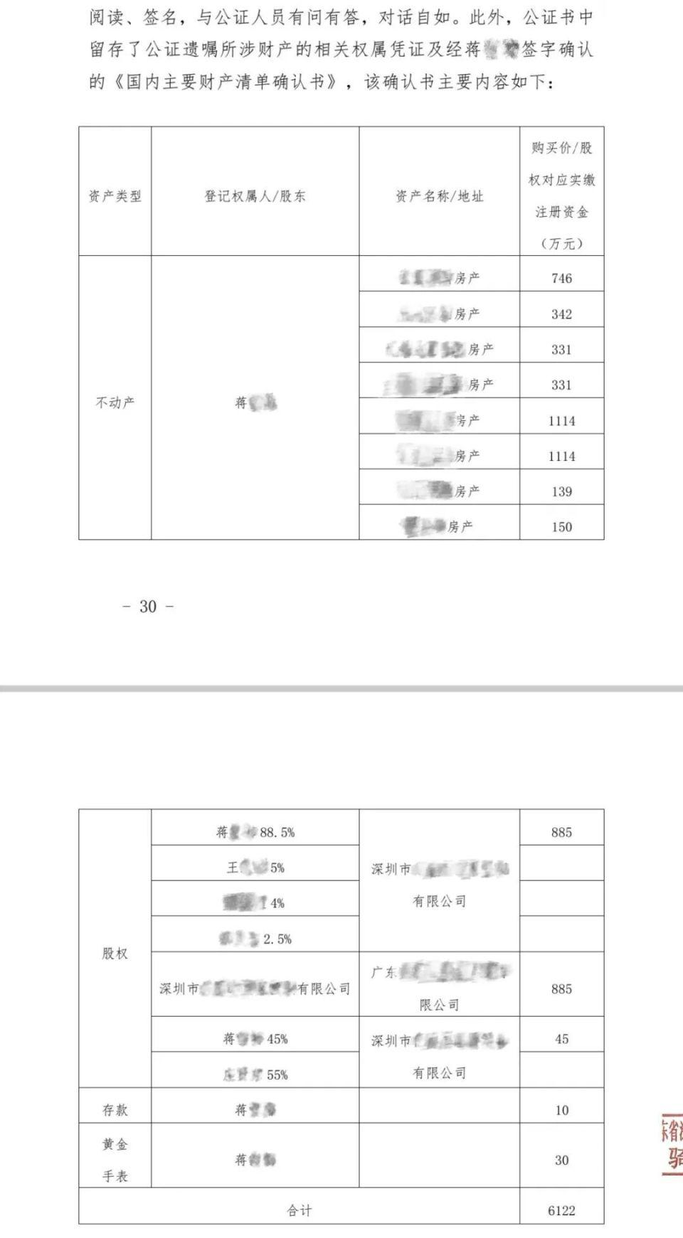 在与张先生离婚前,2023 年 1 月 30 日,蒋女士已订立一份公证遗嘱,将其名下深圳市某公司、广东某公司、某设备公司的股权及相应权益,全部遗赠给朋友王先生。