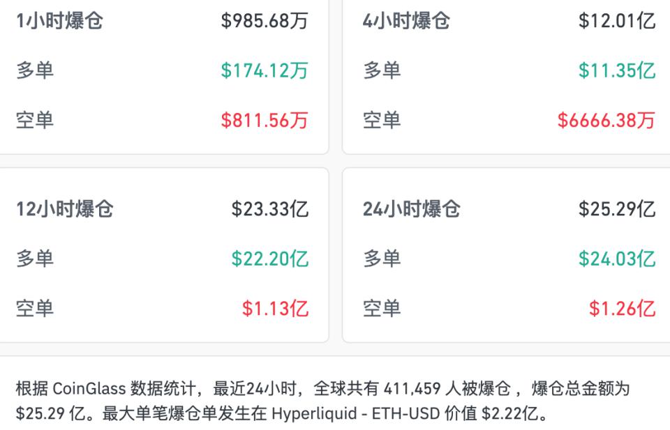 CoinGlass 数据显示,最近 24 小时,全球共有超 41 万人被爆仓,爆仓金额高达 25.29 亿美元(约合人民币 175.8 亿元。)