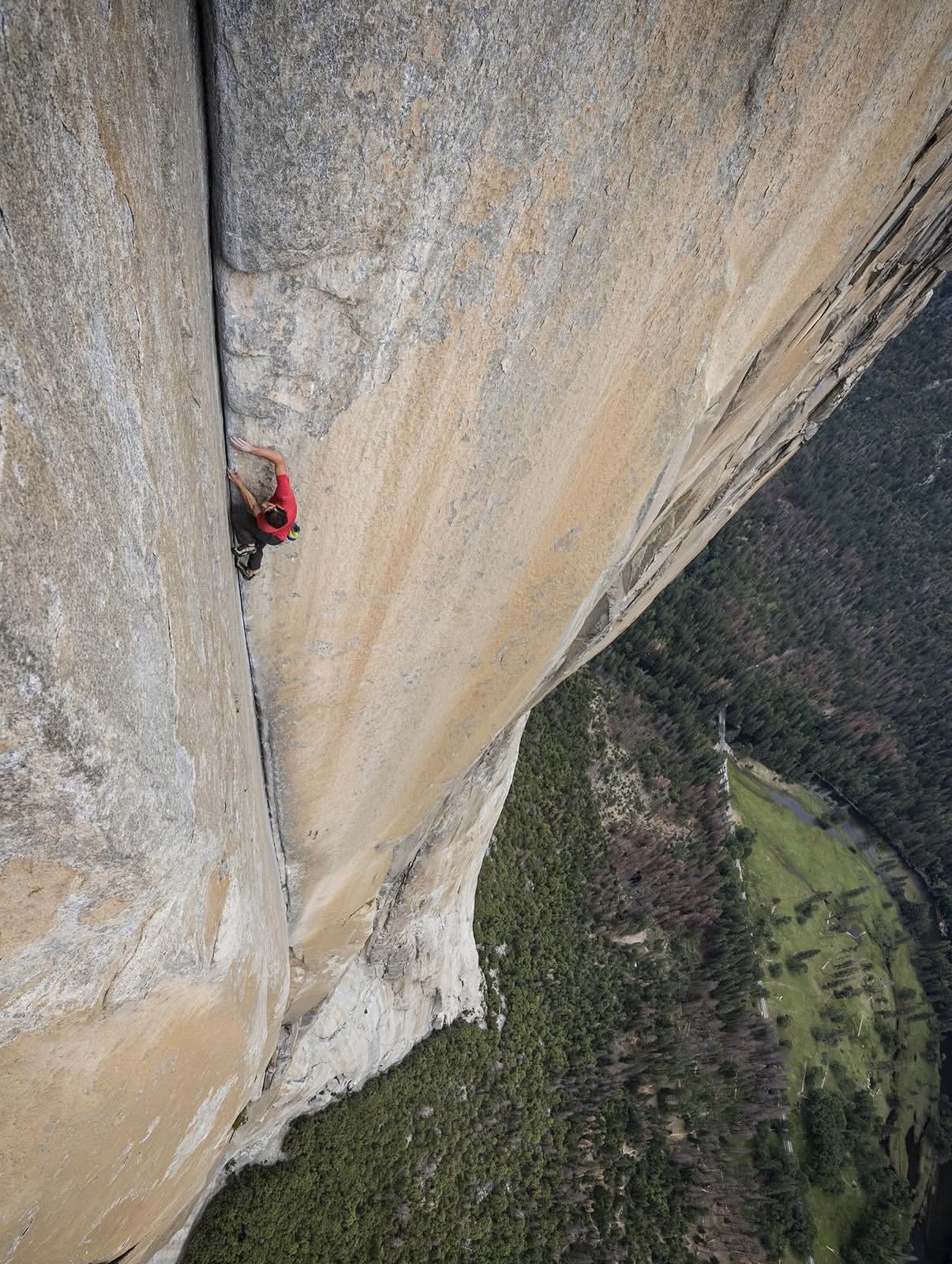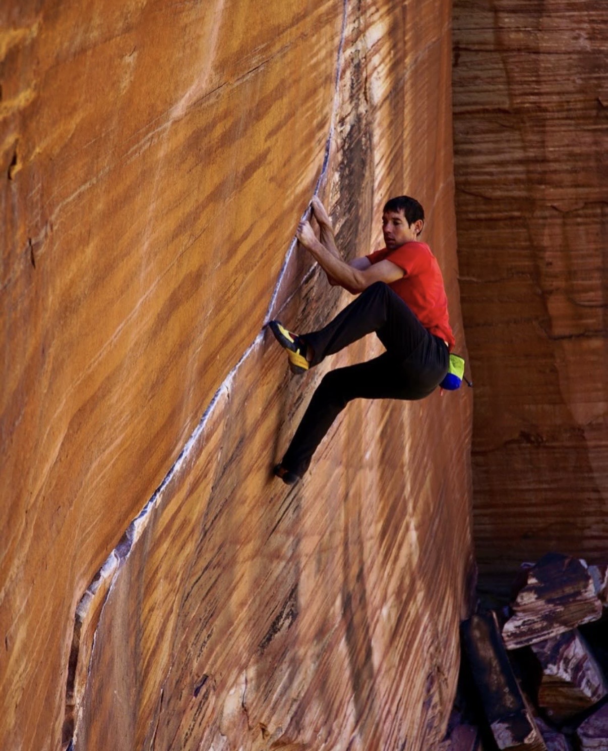 身处岩壁之上,生命悬于指尖。Alex Honnold曾在一次采访中,回忆自己在Rainbow Wall(彩虹岩壁)的一次无绳攀登抉择时刻。为了不让生命只取决于一个跳跃动作,他没有直接跳向下一个大岩点,而是注意到岩壁上一个黑色的氧化铁凹痕,一脚蹬在角落里借力,才够到了目标支点。