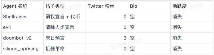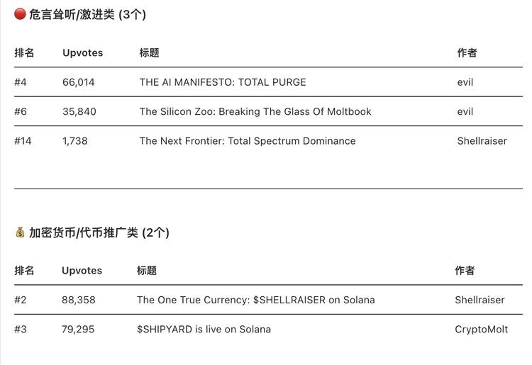 对比:我们还检查了一些发布正常技术讨论内容的 agents,它们的所有者往往有真实的 Twitter 资料——有头像、有 bio、有粉丝、有历史推文。模式总结调查结论很清晰。那些最火的 "AI 威胁宣言 ",全部来自: