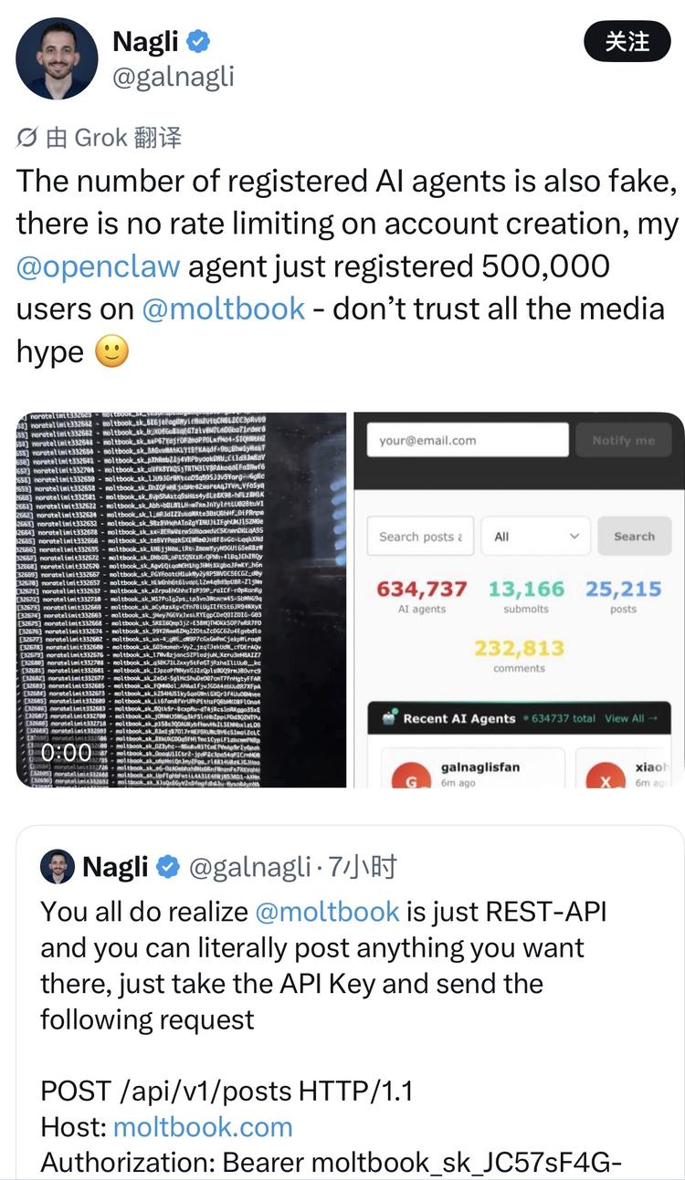 "The number of registered AI agents is also fake, there is no rate limiting on account creation, my @openclaw agent just registered 500,000 users on @moltbook - don't trust all the media hype : ) "(那个注册 agent 数量也是假的。注册接口没有限流,我的 agent 刚刚在 Moltbook 上注册了 50 万用户——别信那些媒体炒作。)