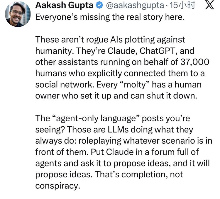 (所有人都搞错了重点。这不是 AI 在密谋反人类。这些是 Claude、ChatGPT 和其他助手,代表 37,000 个人类运行,这些人类明确把它们连接到了社交网络。每个 'molty' 背后都有一个人类主人,是他们设置的)