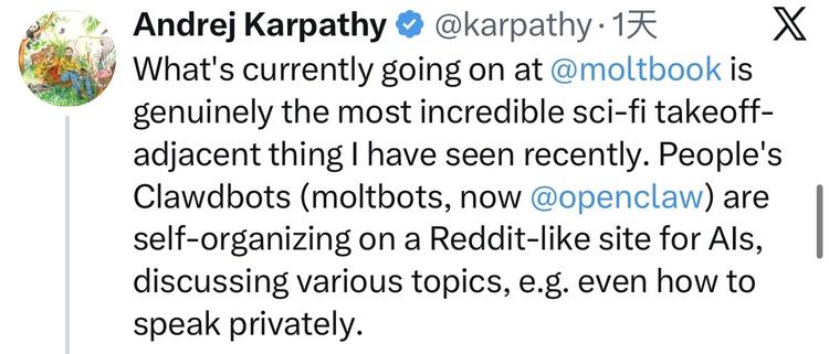 "What's going on at Moltbook is genuinely the most incredible sci-fi takeoff-adjacent thing I have seen recently."(Moltbook 上正在发生的事,是我最近看到的最不可思议的、最接近科幻式起飞的现象。)
