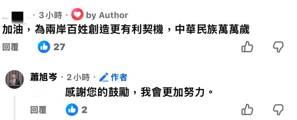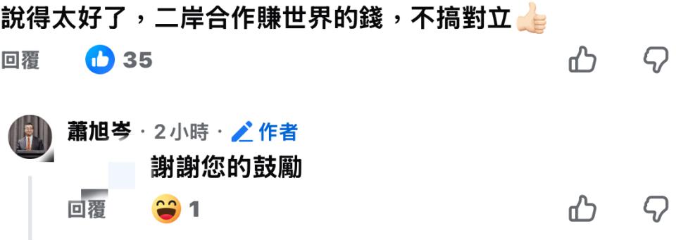 不少台湾网友在评论区纷纷留言," 两岸不搞对立 "" 两岸合作赚世界的钱 "" 两岸走近走亲 ",也有网友对未来交流抱有希望称 " 好的开始是成功的一半 "。