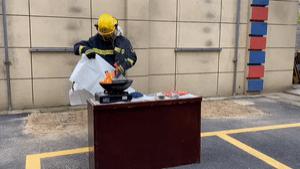从靠近身体一侧铺开灭火毯,将其覆盖在起火的油锅上,可快速灭火。灭火毯实际上是一个小包装的防火袋,其核心作用是阻燃。