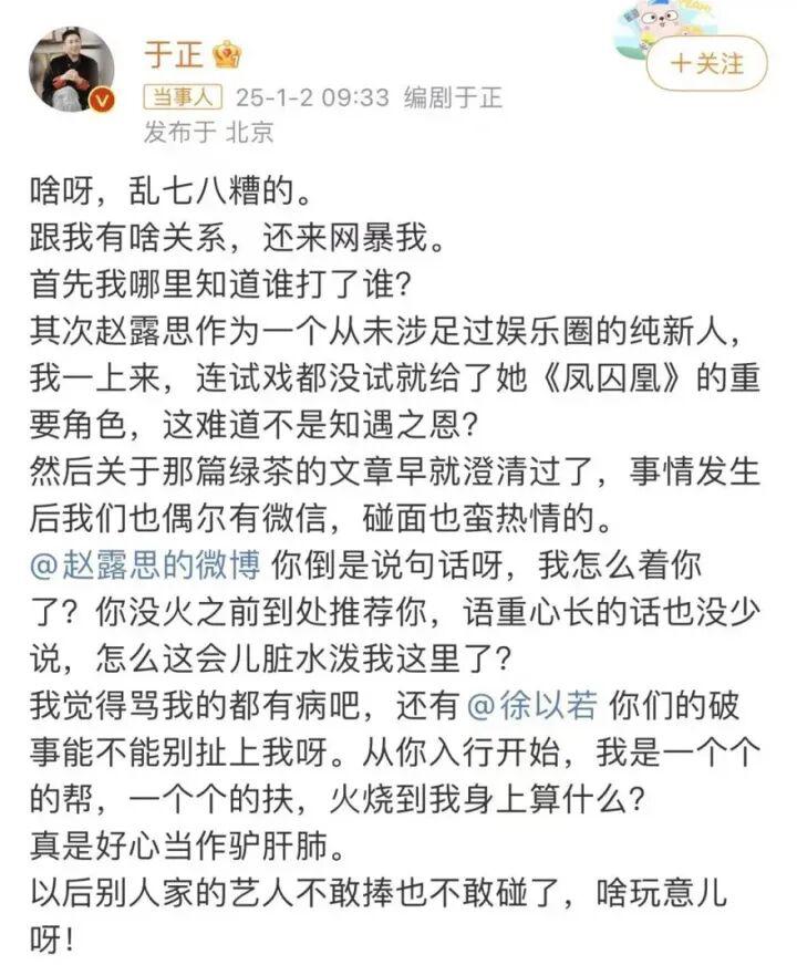 于正曾在微博公开表示:" 连试戏都没试就给了她(赵露思)重要角色。"