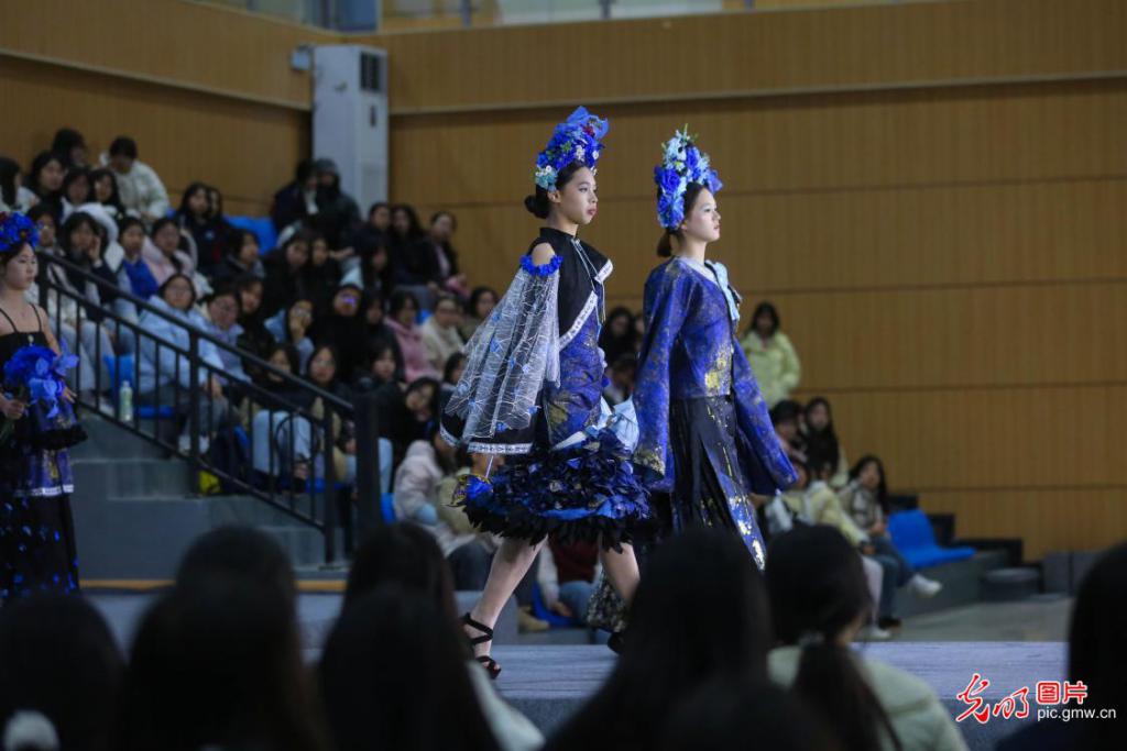 近日,湖南省邵阳市隆回县职业中等专业学校服装专业举行以 " 拾遗 · 织梦 " 为主题的 2026 届学生毕业设计作品展。作品展共 19 个系列,120 多套服装进行集中展示,学子原创作品融合传统技艺与现代创意,以针线织就匠心,用设计诠释梦想。这场青春时尚盛宴,尽显职教学子风采与产教融合育人成果。图为模特社团学生展示服装专业毕业生们设计的服装。 ( 曾勇摄 /光明图片 )